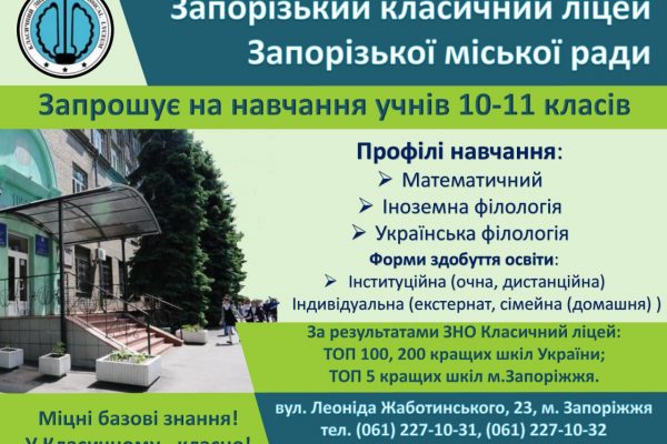 100% вступ випускників в українські та закордонні вищі навчальні заклади, з них більш ніж 80% на бюджет.